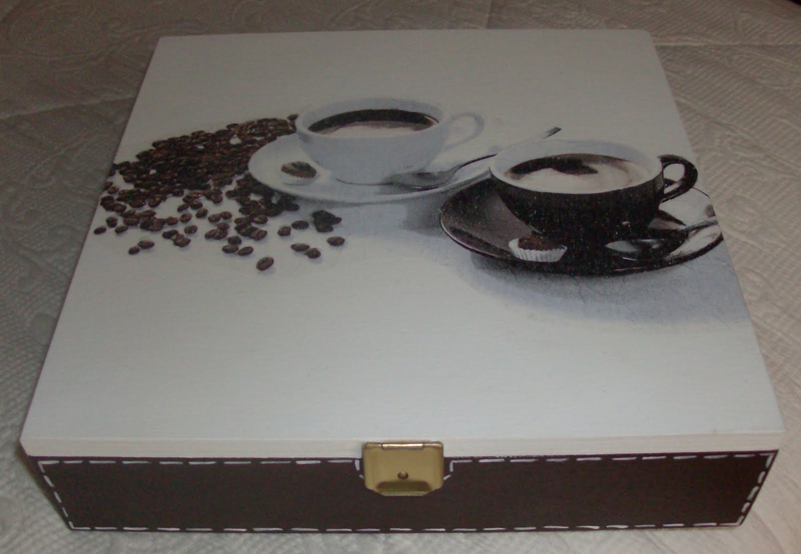 Desta vez decidi dar folga ao senhor jeitoso do post anterior, e fiz esta caixa para guardar outras capsulas de um café, igualmente delicioso, mas com a qualidade nacional...estão a ver qual é?? Ouvi dizer que ficava lá para as bandas de Rio Maior...peço desculpa pela má qualidade das fotos, mas às vezes não temos a camâra digital por perto e temos de improvisar com o telemóvel...
